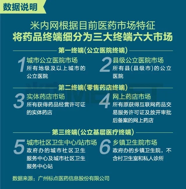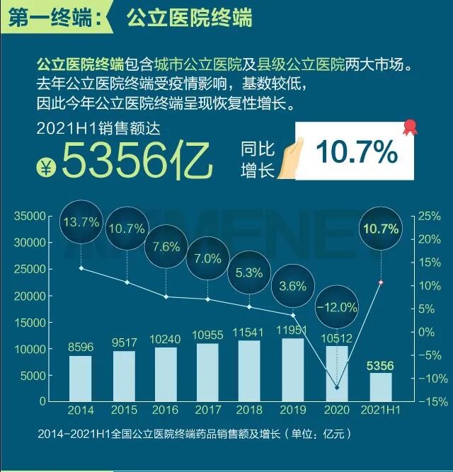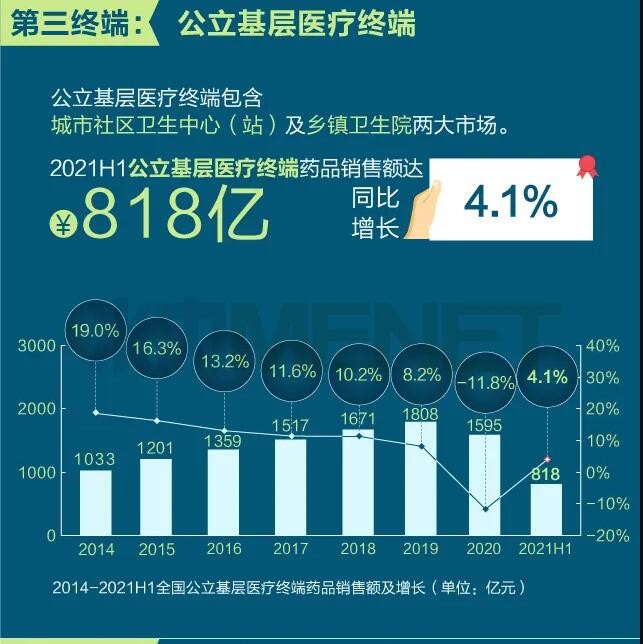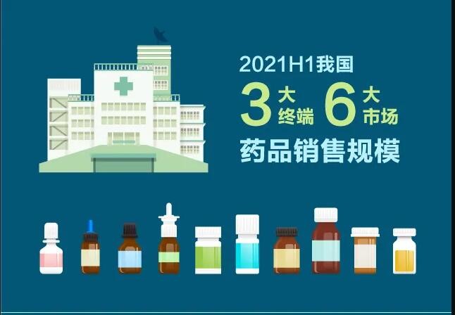 2021年上半年我國三大終端六大市場(定義范圍詳見文末“數據說明”)藥品銷售額達8393億元,同比增長8.8%。從實現藥品銷售的三大終端的銷售額分布來看,公立醫院終端市場份額最大,2021上半年占比為63.8%;零售藥店終端市場份額2021上半年占比為26.4%;公立基層醫療終端市場份額2021上半年占比為9.8%。以上統計數據未包含“民營醫院、私人診所、村衛生室”。